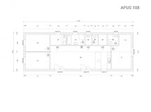 Dom má obdĺžnikový pôdorys s rozmermi 19,15 x 6,80 m. Interiér má premyslené dispozičné rozdelenie domu na spoločenskú a kľudovú časť.