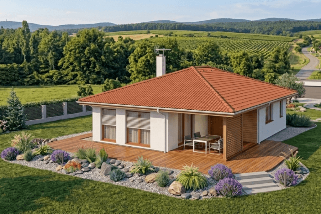 Menší bungalov Nova 103 je vhodný pre štvorčlennú rodinu. Tieto rodinné domy sú veľmi obľúbené. Ale žiadny nie je na 100% rovnaký. Každý realizovaný bungalov Nova je iný, či už vonkajšou podobou alebo vnútorným usporiadaním. Je príjemné sedieť v obývacej izbe a pozorovať veľkými presklenými oknami meniacou sa prírodu. Pokiaľ si doprajete aj krb, potom máte útulný domov zaručený! Skúste na fasádu čiastočný drevený obklad a uvidíte, ako bude dom lahodiť oku.