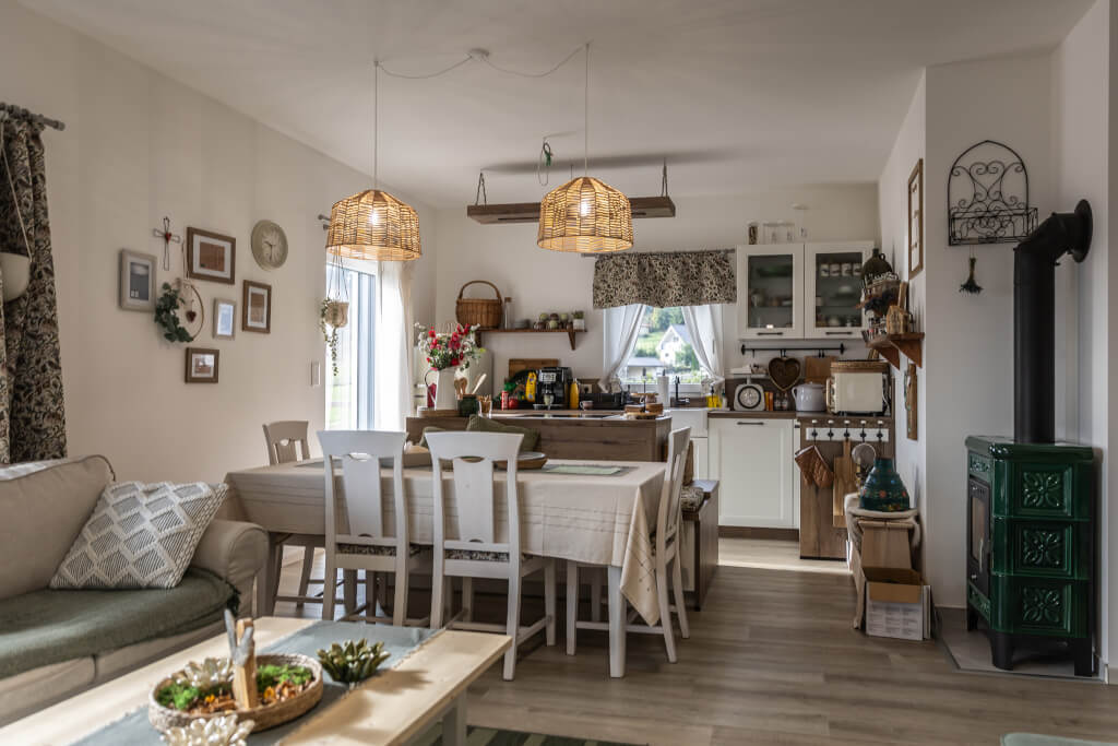 Najviac času rodina trávi v spoločnej obývačke s kuchyňou, ktorá je srdcom chalupy. V zime ju oživuje teplo keramických kachlí, v lete otvorený výhľad na okolité kopce.