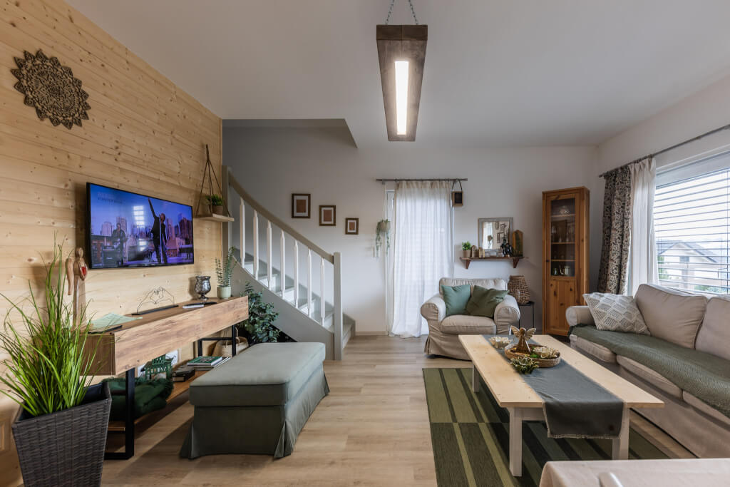 Projekt chalupy pri Dolnom Kubíne zrealizovala spoločnosť ATRIUM SK. Dom je postavený ako drevostavba v difúzne otvorenej konštrukcii DifuTech® Clima COMFORT, ktorá zabezpečuje výborné tepelnoizolačné vlastnosti (U = 0,14 W/m²K) a zdravú mikroklímu v interiéri. Strechu tvorí sedlová konštrukcia s betónovou krytinou Bramac, odolnou proti horským podmienkam. Kompozitné okná majú vynikajúce tepelnoizolačné vlastnosti vhodné do daného prostredia, ktoré prispievajú k úspore energií aj k celkovému komfortu bývania. Chalupa bola dodaná v štandarde vybavenia All Inclusive, čo znamená, že po dokončení stačilo doplniť kuchynskú linku, nábytok a svietidlá. Vykurovanie a ohrev vody zabezpečuje výkonné tepelné čerpadlo vzduch – voda s integrovaným zásobníkom TÚV, ktoré možno ovládať aj na diaľku pomocou aplikácie, čo klient v tomto prípade určite ocenil. Projekt bol pritom prispôsobený horskej lokalite – dôraz sa kládol na správnu orientáciu, rýchle vykúrenie interiéru a efektívnu prácu s teplom.