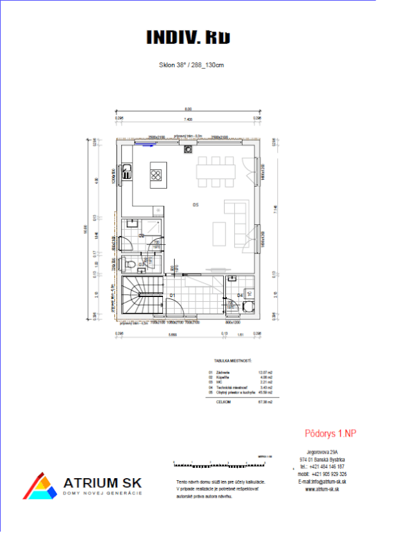 - Prízemie: Zádverie 12,07m2,1X Kupeľňa 4,08m2,1xWC2,21m2,Tech.miestnosť3,43 m2,Obyt.priestor a kuchyňa 45,59m2