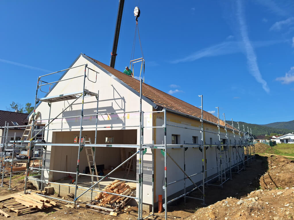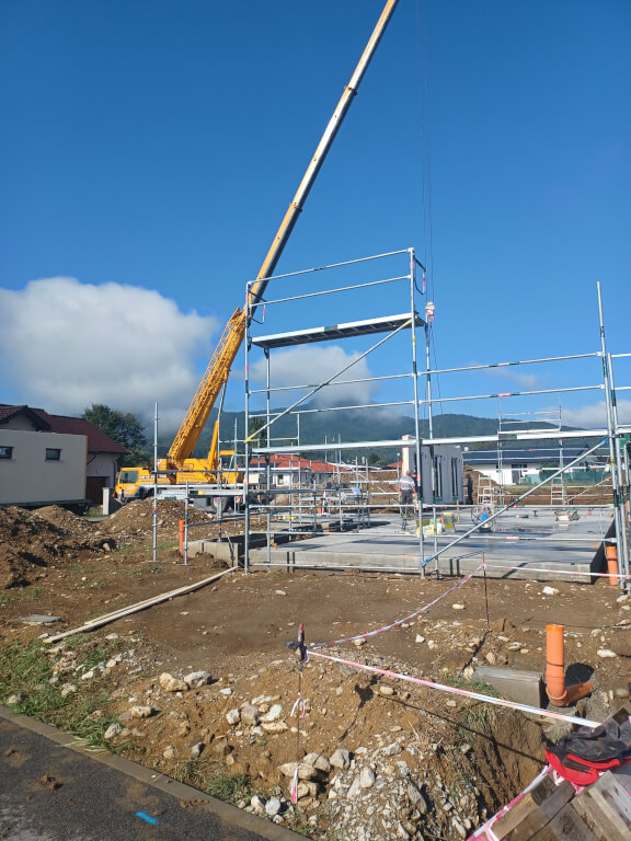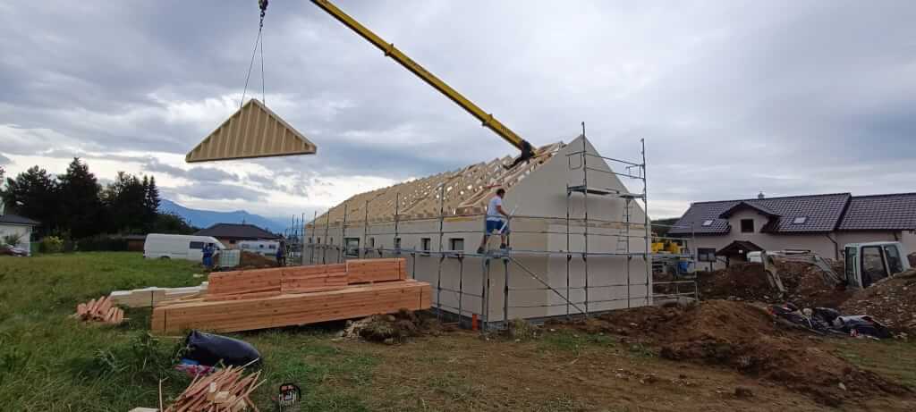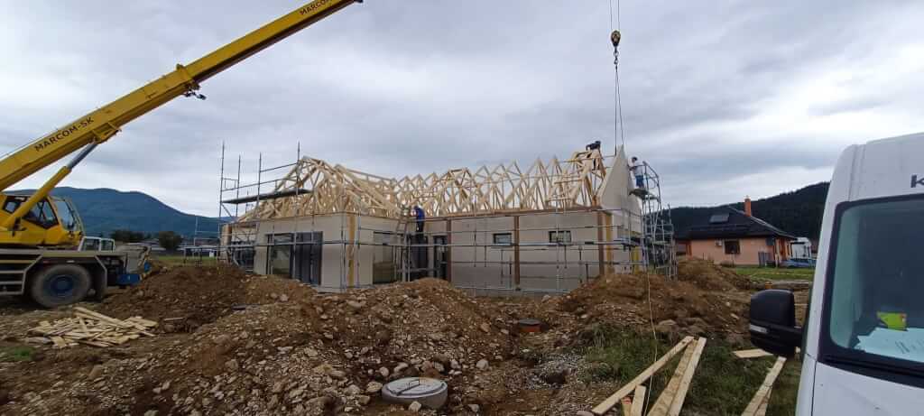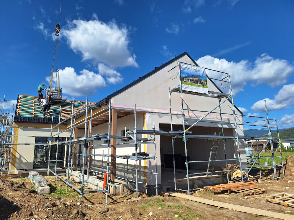 Práve prebieha montáž drevodomu - v jednotlivých krokoch výstavby .