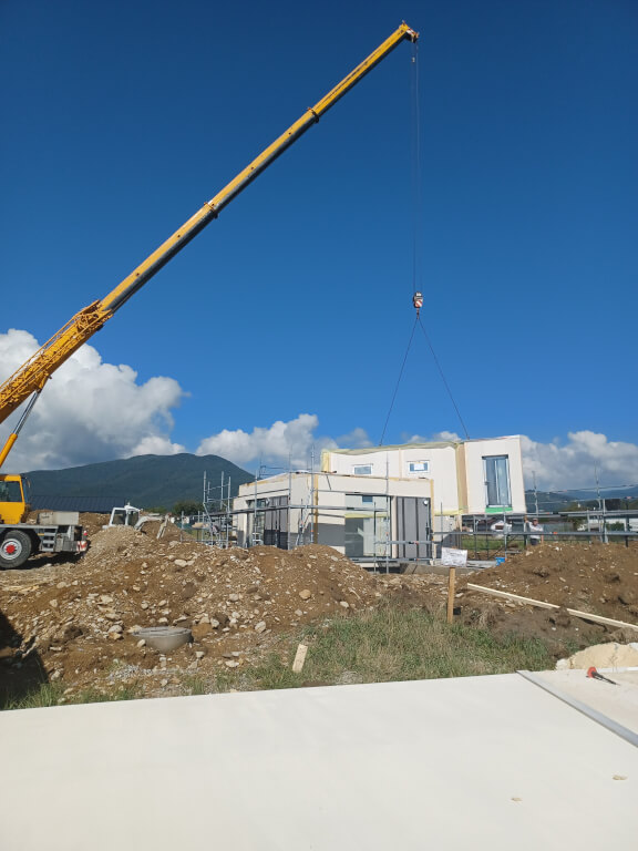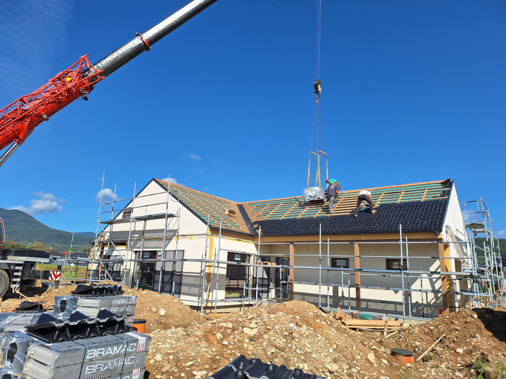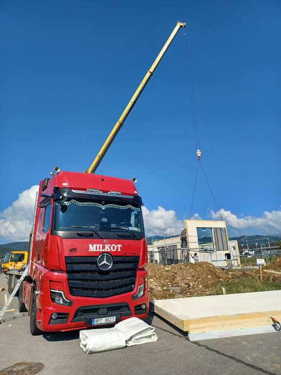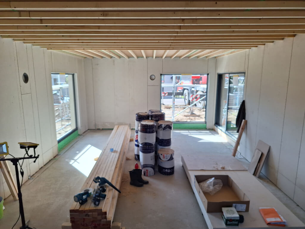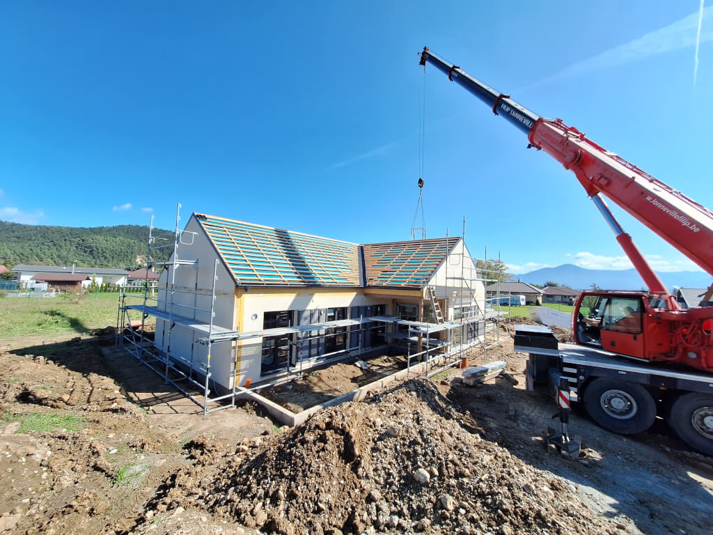 Práve prebieha montáž drevodomu - v jednotlivých krokoch výstavby .